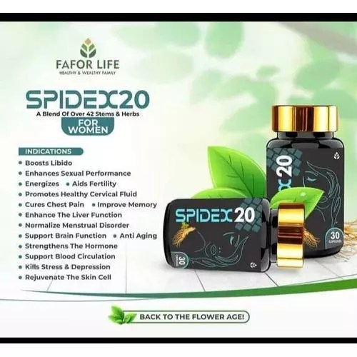 SP Spidex 20 FOR WOMEN Is a pure organic herbal blend of more than 42 stem cells, it helps rejuvenate as well as awaken sexual performance in women, it revitalizes sexual vigor as well as boosts libido levels in a new dimension. As a matter of fact, it works perfectly for numerous health impairments in women, such as stress reduction, hormonal balance, anti-aging, and skin health.